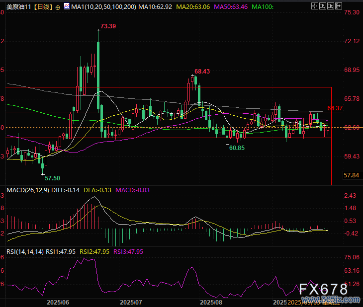 第一压力位在63.00的整数关隘,为10日均线和100日均线交织处。相似是9月19日下降的50%分位。要是油价向下发展,第一因循依然看61.50的交游密集区,值得把稳的是,本月仍是三次测试61.50整数关隘了,原油之后达到此位置可能会跌破并使油价向下发展。